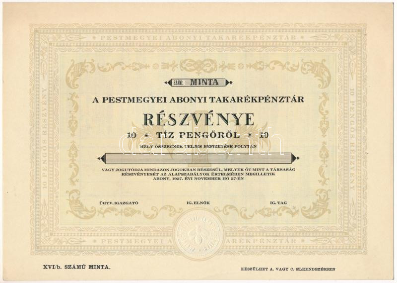 Abony 1927. "Pestmegyei Abonyi Takarékpénztár" részvénye 10P... https://www.darabanth.com/de/484-Fernauktion/484.0/Numismatik/Aktien-und-Tickets~500006/Abony-1927-Pestmegyei-Abonyi-Takarekpenztar-reszvenye-10P-rol-szarazpecsettel-szelvenye~II3277752