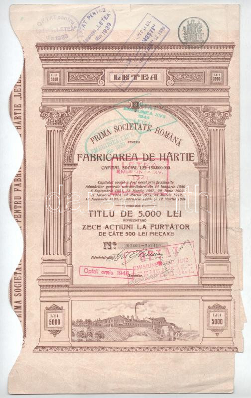 Románia 1938. "Prima Societate Romana pentru Fabricarea de Hartie (Az első román papírgyártó társaság)" részvénye 5000L-ről szelvényekkel, bélyegzésekkel T:F