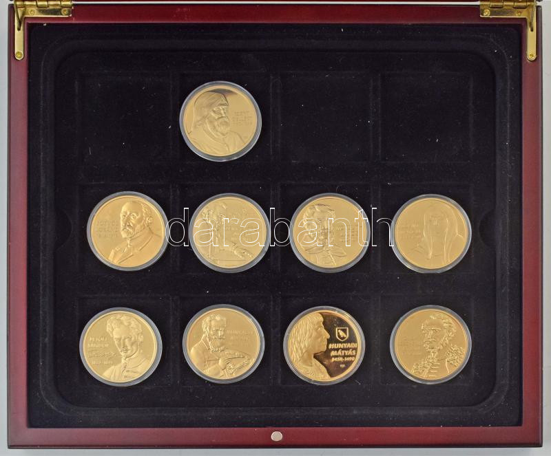 ifj. Szlávics László (1959- ) 2011. "Nagy Magyarok" sorozat 9db aranyozott Cu emlékérem tétel, benne: Szent Gellért, Petőfi Sándor, Eötvös Lóránd, Szent Margit, Hunyadi Mátyás, Munkácsy Mihály, Szent-Györgyi Albert, Kossuth Lajos, Gróf Széchenyi István (40mm) +