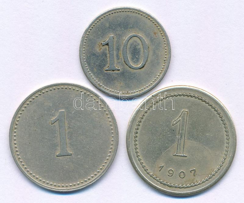 1907. 1K Cu-Ni "A Magy. Kir. Államvasutak Alkalmazottai Fogyasztási Szövetkezete" bárca + DN 10f Cu-Ni "A Magy. Kir. Államvasutak Alkalmazottai Fogyasztási Szövetkezete" bárca, évszámjelzés nélküli típus + 1K Cu-Ni "A Magy. Kir. Államvasutak Alkalmazottai Fogyasztási Szövetkezete" bárca, évszámjelzés nélküli típus T:XF