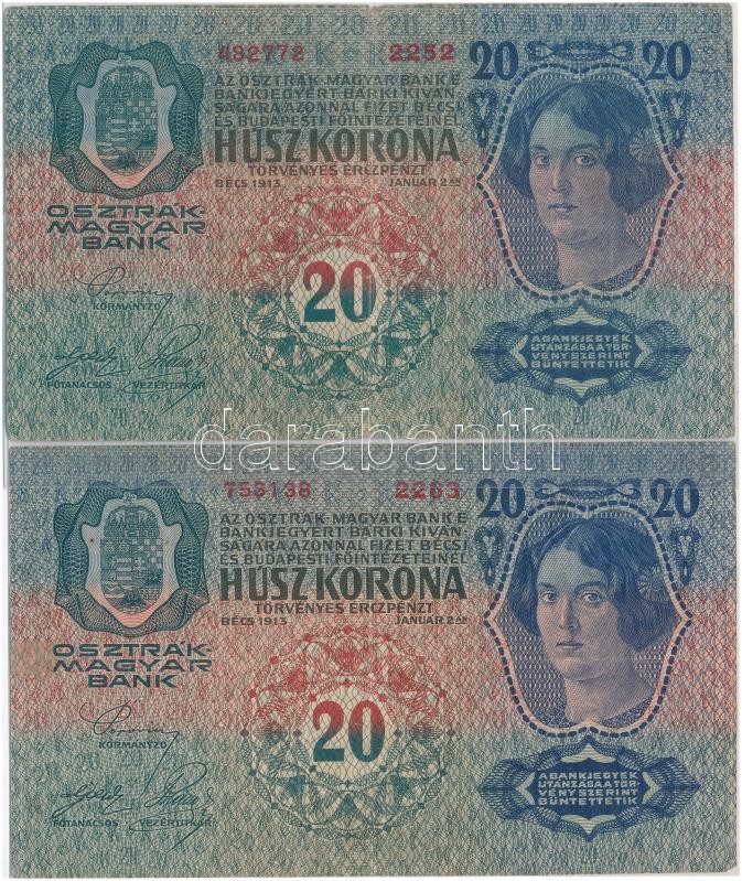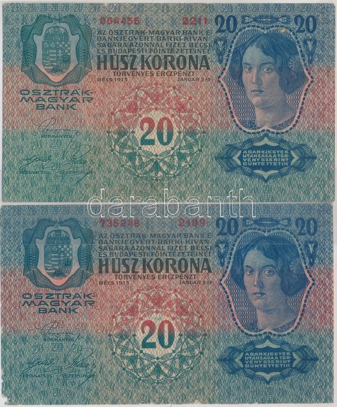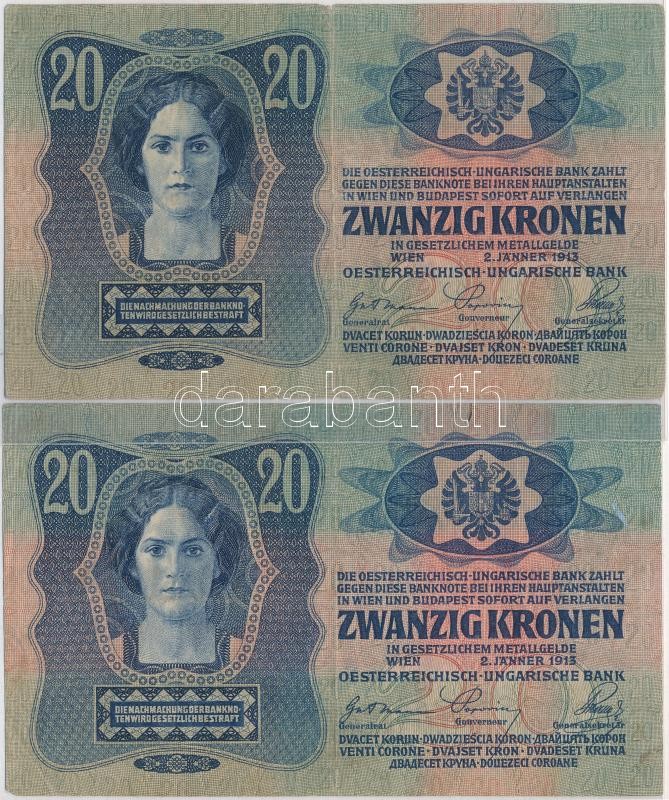 1913. 20K (4x) T:III,III- egyiken kis szakadás https://www.darabanth.com/de/484-Fernauktion/484.0/Numismatik/Ungarische-Banknoten~500008/1913-20K-4x-TIII-III-egyiken-kis-szakadas~II1914097