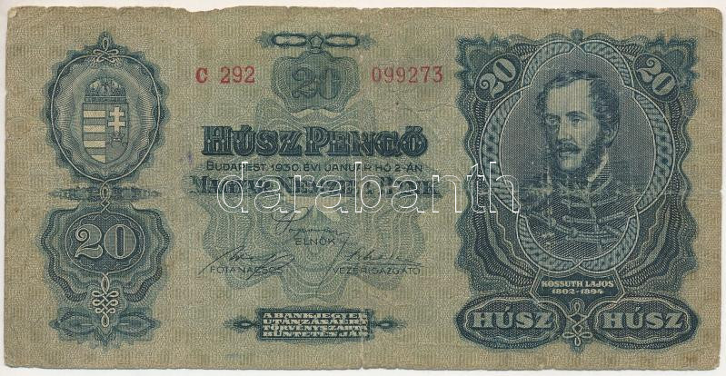 1930. 20P "C 292 099273" T:VG Adamo P11 https://www.darabanth.com/de/484-Fernauktion/484.0/Numismatik/Ungarische-Banknoten~500008/1930-20P-C-292-099273-TVG-Adamo-P11~II3275458