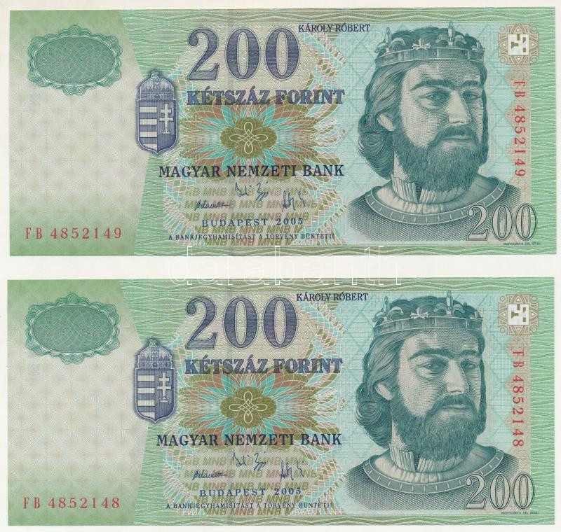 2005. 200Ft (2x) sorszámkövetők "FB 4852148 - FB 4852149" T:... https://www.darabanth.com/de/484-Fernauktion/484.0/Numismatik/Ungarische-Banknoten~500008/2005-200Ft-2x-sorszamkovetok-FB-4852148-FB-4852149-TUNC~II3261978