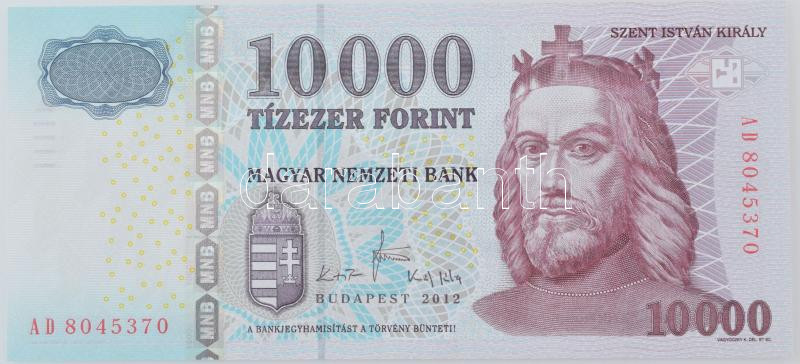 2012. 10.000Ft "AD 8045370" T:AU, pici sarokhajlás https://www.darabanth.com/de/484-Fernauktion/484.0/Numismatik/Ungarische-Banknoten~500008/2012-10000Ft-AD-8045370-TAU-pici-sarokhajlas~II3272766
