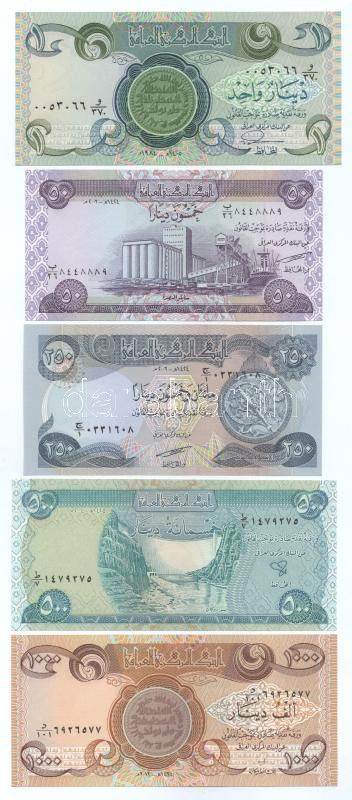 Iraq (1405)1984. 1 Dinar + (1424)2003. 50 Dinars + (1424)2003. 250 Dinars + (1425)2004. 500 Dinars + (1434)2013. 1000 Dinars C:UNC-AU