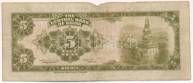 Beschreibung: Kína 1945. 5Y "Central Bank of China" T:F,VG anyaghiány