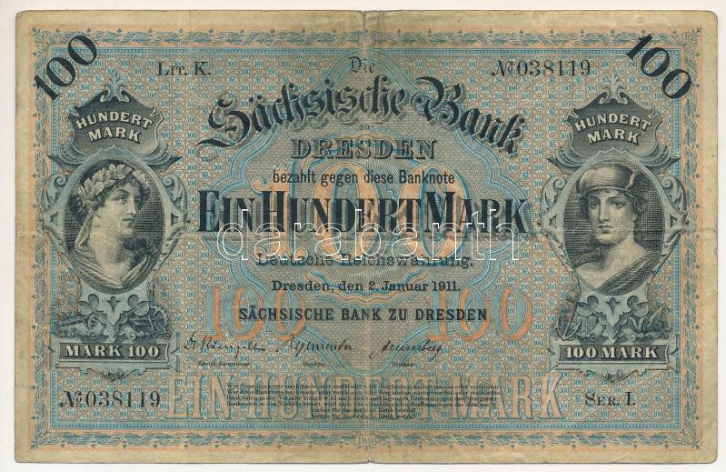 Német Birodalom / Szászország 1911. 100M "hatjegyű sorozatszám" T:F,VG German Empire / Saxony 1911. 100 Mark "six digit serial number" C:F,VG Krause P#S952