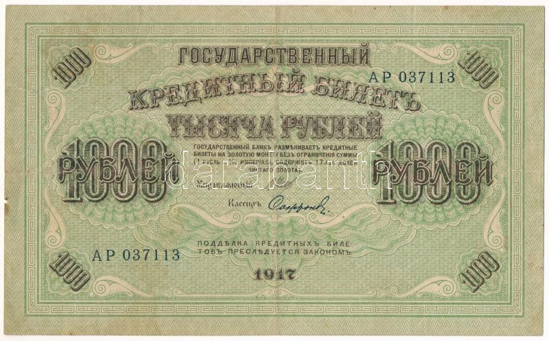Orosz Birodalom 1917. 1000R Szign.: Shipov T:F, szakadások, pici anyag... https://www.darabanth.com/de/484-Fernauktion/484.0/Numismatik/Weltweit-Banknoten~500014/Orosz-Birodalom-1917-1000R-Szign-Shipov-TF-szakadasok-pici-anyaghiany3Cbr-3E-Russian-Empire-~II3291641
