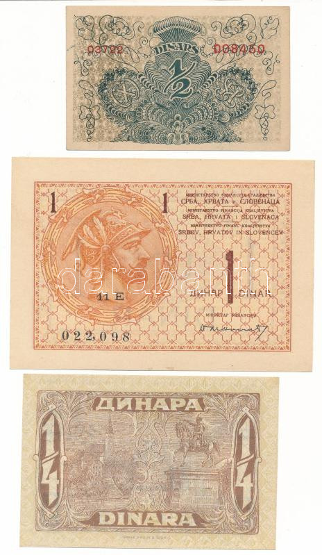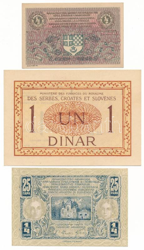 Beschreibung: Szerb-Horvát-Szlovén Királyság 1919. 1/2D "03722 008450" + DN (1919.) 1D "11E 011,098" + 1921. 25p / 1/4D T:UNC,AU