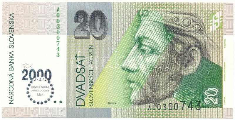 Slovakia 1993. 20 Korun "A00300743" with Millennium overprint C:AU