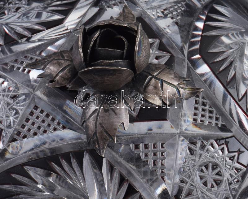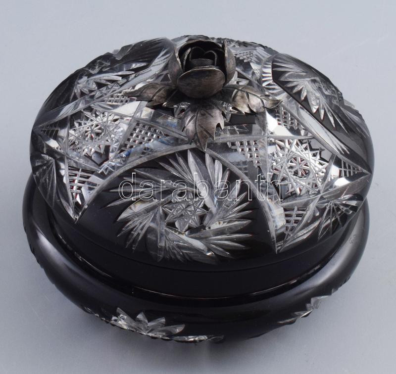 Beschreibung: Kristály bonbonier, fém rózsa fogóval, jelzés nélkül, d: 12,5 cm