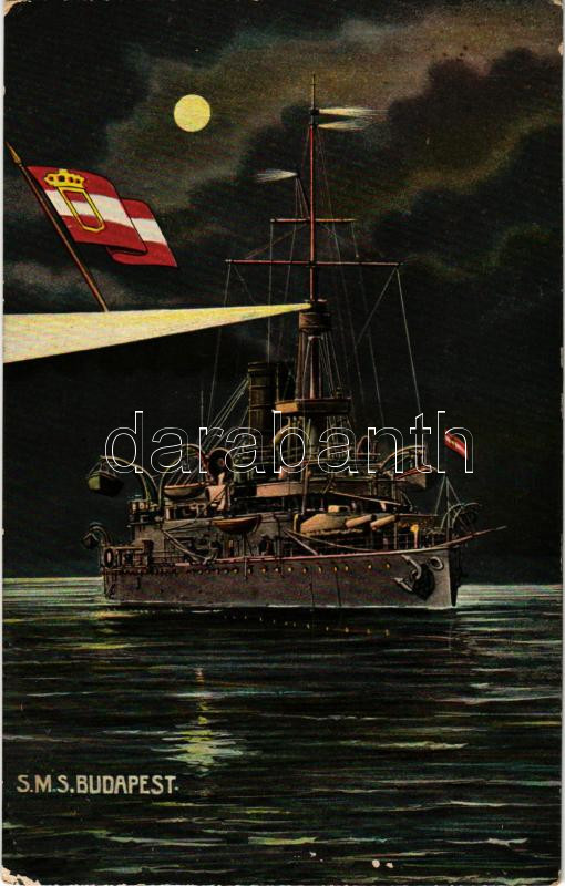 1909 SMS Budapest az Osztrák-Magyar Haditengerészet Monarch-osztályú partvédő páncélosa éjjel / K.u.K. Kriegsmarine / Austro-Hungarian Navy SMS Budapest Monarch-class coastal defense ship, at night, naval flag. G. Fano, Pola 1908-9. No. 26. (r)