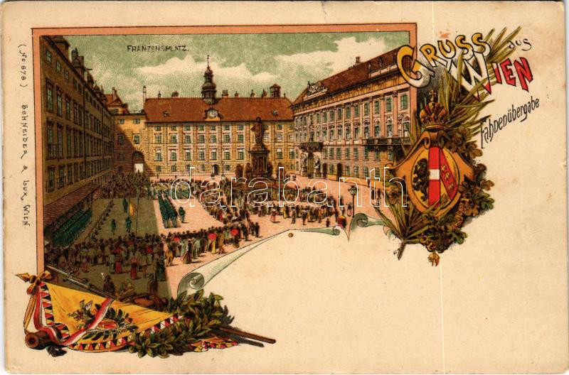 Beschreibung: Wien, Vienna, Bécs; Fahnenübergabe, Franzensplatz / flag handover, K.u.K. military guard, coat of arms. Schneider & Lux Art Nouveau, floral, litho (tear)
