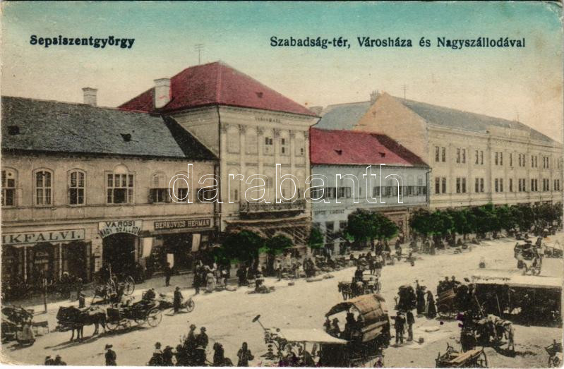 1918 Sepsiszentgyörgy, Sfantu Gheorghe; Szabadság tér, Városháza, Városi nagy szálloda és kávéház, piac, Bikfalvi és Berkovics Herman üzlete. Hangya szövetkezet kiadása / square, market, town hall, hotel, shops (EK)
