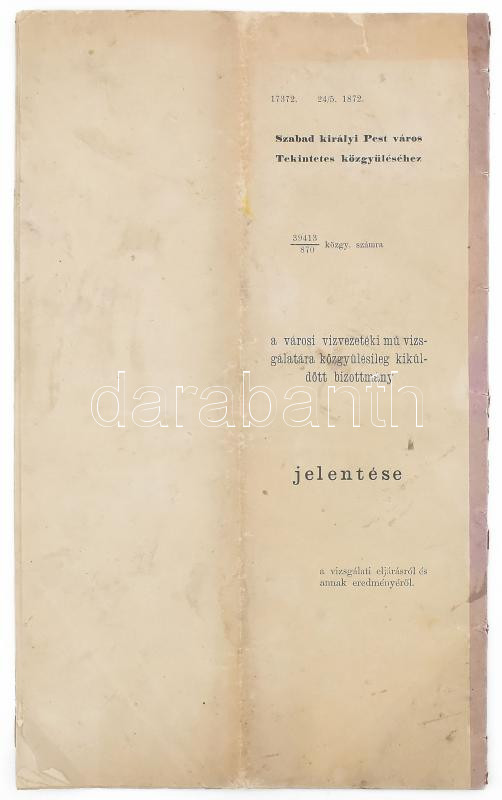 Beschreibung: 1872 Pest városának közgyűlési jegyzőkönyve, benne a vízművek jelentésével 30p.