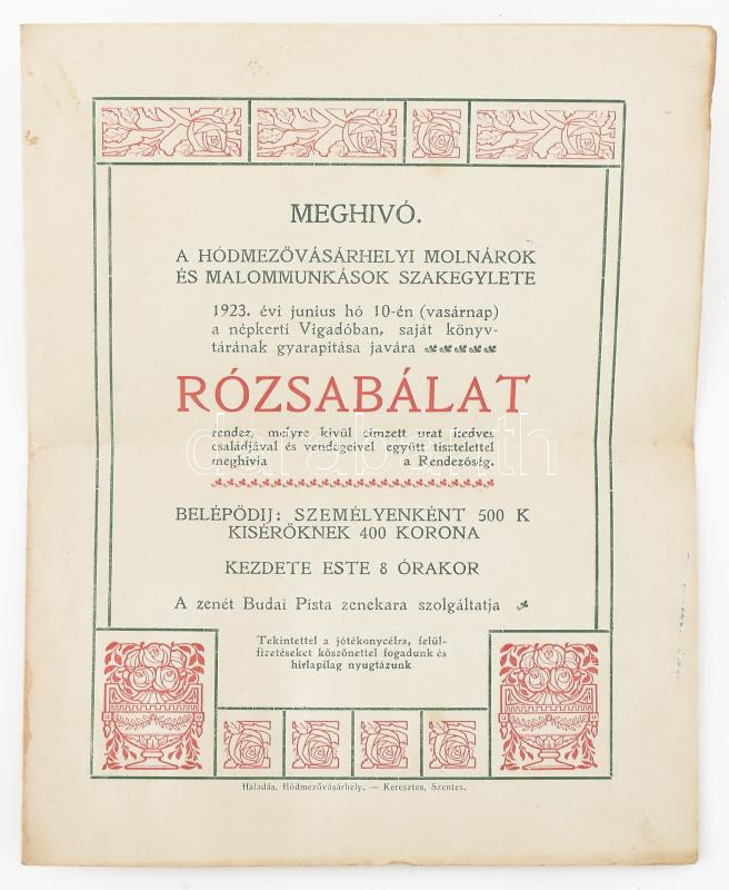 1923 Hódmezővásárhely, Rózsabál meghívó https://www.darabanth.com/de/485-Fernauktion/485.0/Kunst-Dokumente-andere-Sammelgebiete/Drucksachen~2000029/1923-Hodmezovasarhely-Rozsabal-meghivo~II3317277