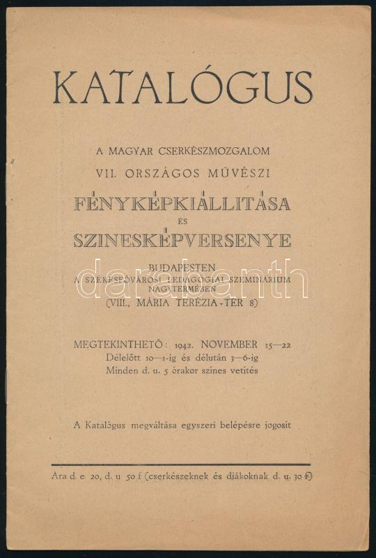 1942 A Magyar Cserkészmozgalom VII. Országos Művészi Fényképkiállítása... https://www.darabanth.com/de/485-Fernauktion/485.0/Kunst-Dokumente-andere-Sammelgebiete/Drucksachen~2000029/1942-A-Magyar-Cserkeszmozgalom-VII-Orszagos-Muveszi-Fenykepkiallitasa-es-Szineskepversenye-~II3318863