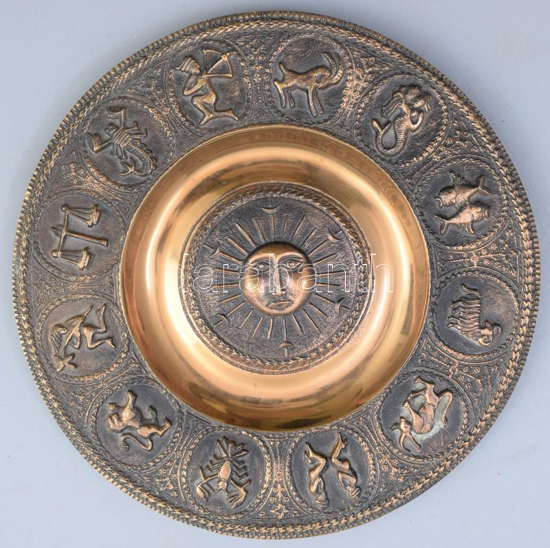 Beschreibung: Horoszkópos fali dísztál. Bronz, jelzés nélkül, d: 17 cm