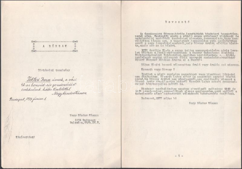 1977 Nagy Sándor Kászon: A bűnbak. Történelmi tanulmány. [Görgey Artúrról.] Gépelt kézirat. A szerző által dedikált, valamint szerző autográf levelével, 15 sztl. lev. + 1 sztl. lev. Borítékkal. Valamint + 1980 A dedikáció és a levél címzettjének, Töltési Imrének, aHazafias Népfront Honismereti Bizottsága titkárának autográf levele, melyben leírja, hogy felhasználásra megküldi a tanulmányt.