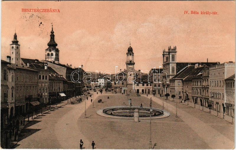 1917 Besztercebánya, Banská Bystrica; IV. Béla király tér, gyógyszertár, városháza, Ehrenwald Gyula üzlete. Machold F. kiadása / square, pharmacy, town hall, shops