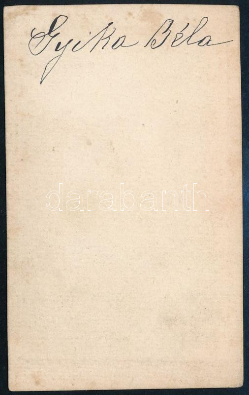 Beschreibung: cca 1860-1870 (nemes) Gyika Béla egészalakos portréja, díszmagyarban, vizitkártya, jelzés nélkül, a hátoldalon (autográf?) felirattal, 9,5x6 cm