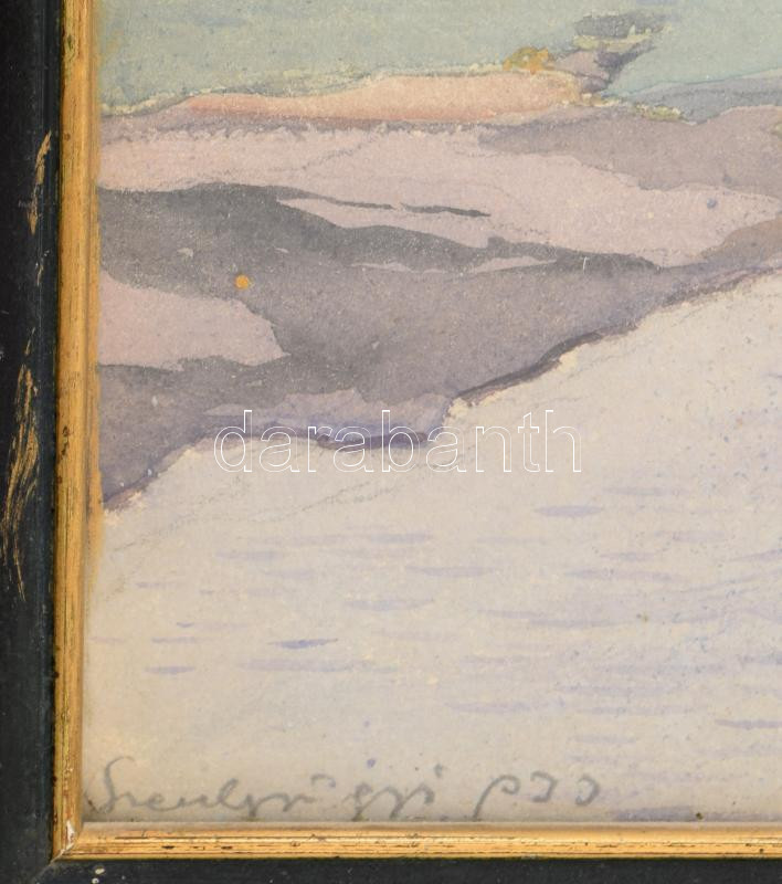 Beschreibung: Szentgyörgyi jelzéssel: Rohac-hegység (Rohács, Tátra), 1933. Akvarell, papír, hátoldalán korabeli felirattal. 40×30 cm. Dekoratív, üvegezett, korabeli sérült fakeretben.