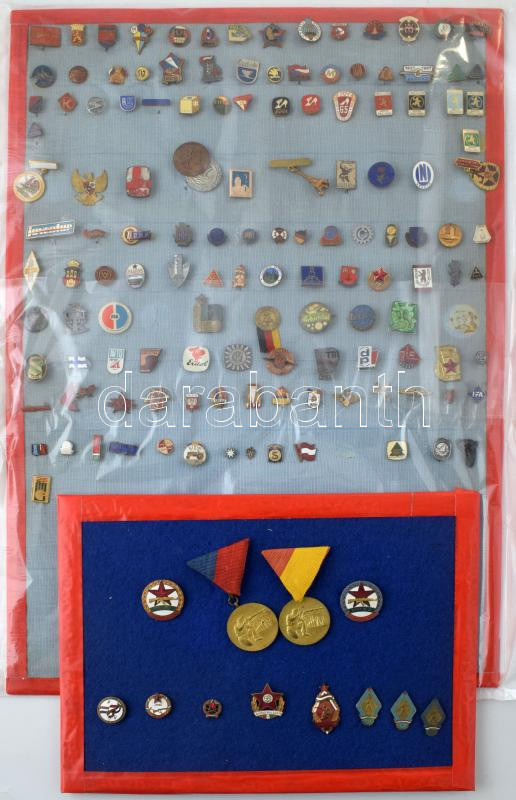 ~144db vegyes magyar és külföldi jelvény a szocialista időszakból, közte festett és zománcozott darabok, közte 2db MSZHSZ (Magyar Szabadságharcos Szövetség) lövész díjérem, két lapra tűzve T:vegyes