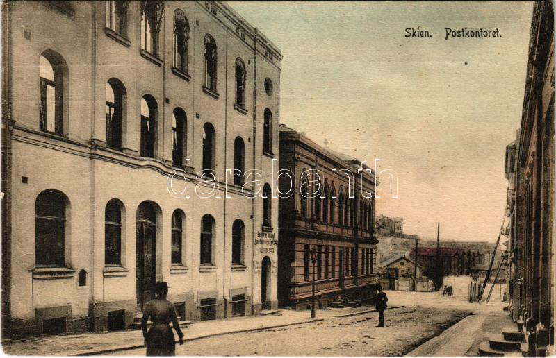 Skien, Postkontoret / street view, post office (small tear) https://www.darabanth.com/de/488-Fernauktion/488.0/Ansichtskarten/Norwegen~2500060/Skien-Postkontoret-street-view-post-office-small-tear~II3143317