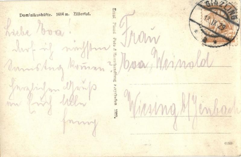 1929 Zillertal (Uderns), Dominikushütte 1684 m / rest house, tourist h... https://www.darabanth.com/de/488-Fernauktion/488.0/Ansichtskarten/Osterreich~2500025/1929-Zillertal-Uderns-Dominikushutte-1684-m-rest-house-tourist-hut-chalet-Ernst-Pfund-photo~II1905631