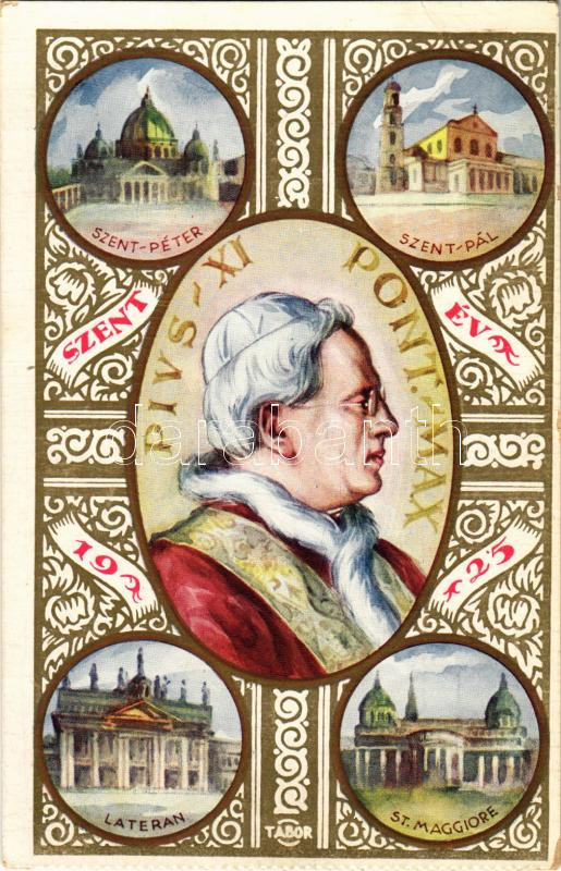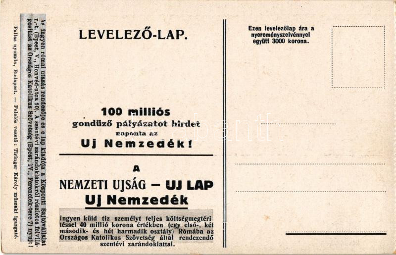 1925 Pius XI Pont. Max. Szent Év Magyarok Nemzeti zarándoklata Rómába. A Nemzeti Újság ingyenes római utazás nyereményjátéka / Hungarian National Pilgrimage to Rome. Trip prize advertisement on the backside s: Tábor