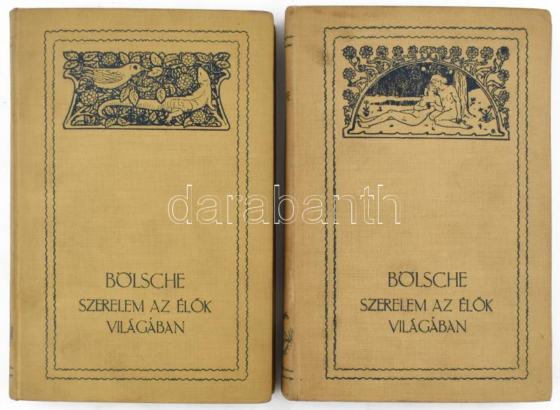 Bölsche Vilmos [Wilhelm]: Szerelem az élők világában. II-III. köt. Ford.: Kremmer Dezső, Sidó Zoltán, Merényi József. Bp., 1910, Politzer Zsigmond és Fia, 4 sztl. lev.+ 368 p.; 4 sztl. lev.+ 354 p. Szecessziós könyvdíszekkel. Kiadói szecessziós egészvászon-kötés, festett lapélekkel, jó állapotban.