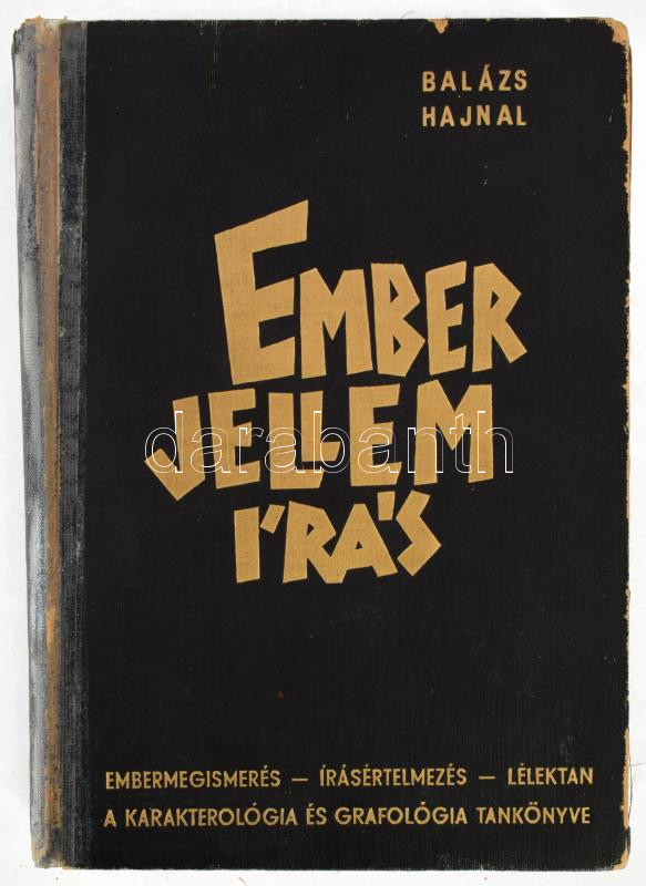 Dr. Balázs Dezső-Dr. Hajnal Richárd: Ember, jellem, írás. Bp., (1940), Novák Rudolf és Társa. Kiadói aranyozott egészvászon-kötés, kopott borítóval, sérült, gerinccel, az elülső kötéstábla részben elvált a könyvtesttől.