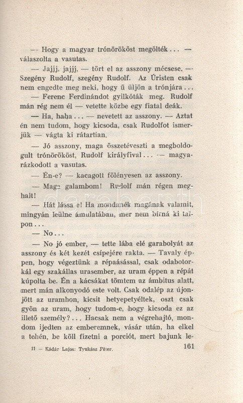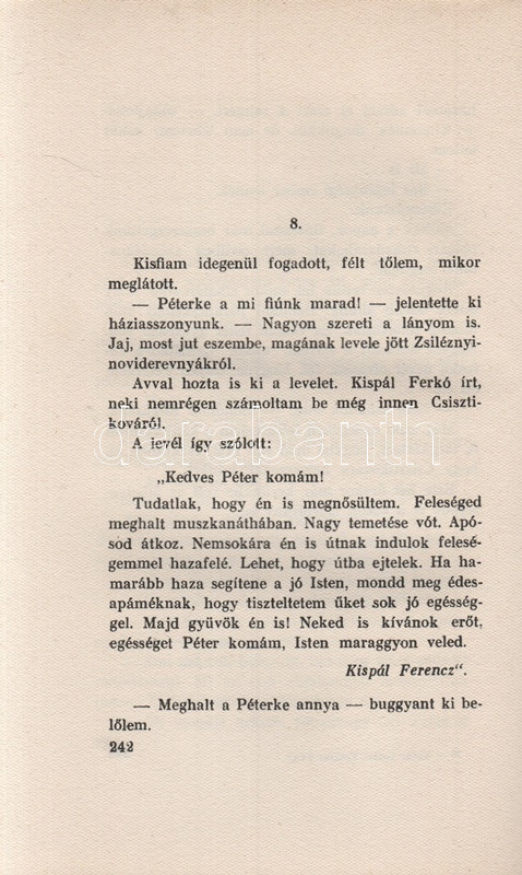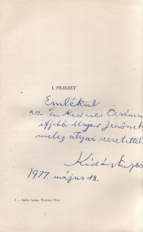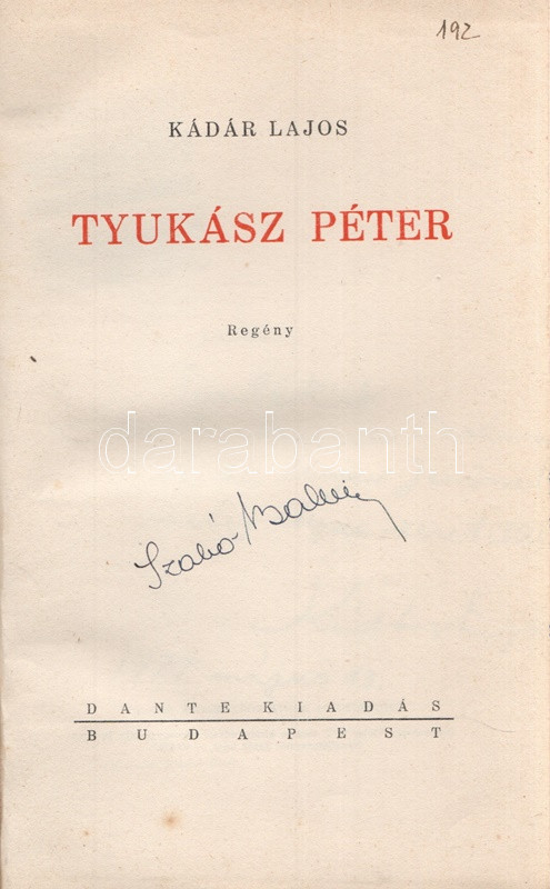 Kádár Lajos: Tyukász Péter. Regény. (Dedikált.) Budapest, (1938). Dante Könyvkiadó (Hornyánszky Viktor Rt. ny.) [2] + 284 + [4] p. Dedikált: "Emlékül az én kedves öcsémnek, ifjabb Kádár Jenőnek meleg atyai szeretettel: Kádár Lajos. 1977. május 19." Kádár Lajos (1896-1986) író, Móricz Zsigmond felfedezettje. Önéletrajzi elemekben gazdag regénye egy alföldi szegény paraszti hős életét követi az első világháború előtt, katonai szolgálata alatt, orosz, majd szovjet hadifogságában, végül hazatérése után. A regény első kiadása 1937-ben jelent meg a Harmónia Kultúrbizottság gondozásában, példányunk a Dante Könyvkiadó által gondozott kiadásból való. Népi motívummal illusztrált kiadói egészvászon kötésben. Jó példány.