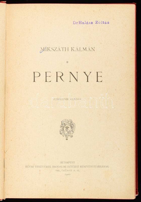 Mikszáth Kálmán: Pernye. Mikszáth Kálmán munkái. Bp., 1900, Révai, 4 sztl. lev.+229 p. harmadik kiadás. Kiadói dekoratív, aranyozott, illusztrált egészvászon sorozatkötés, Gottermayer-kötés, festett lapélekkel,gerincen kis sérüléssel