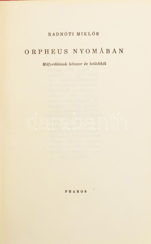 Radnóti Miklós: Orpheus nyomában. Műfordítások kétezer év költőiből. (Budapest, 1943). Pharos kiadóvállalat (Hellas Irodalmi és Nyomdai Rt.) 191 + [1] p. Első kiadás. A költő műfordításait egész oldalas, fametszetű költő-portrék kísérik. A kötet végén Radnóti Miklós rövid esszéje műfordítási elveiről. Korabeli félvászon kötésben.