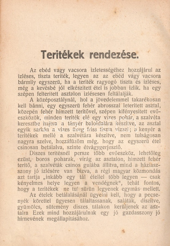 A klasszikus szakácskönyv első kiadása 1893-ban jelent meg, Mezőtúron. Példányunk a mű sorrendben nyolcadik, teljesen átdolgozott kiadása. Oldalszámozás nélkül. Néhány levél fűzése meglazult, néhány oldalon apró, halvány foltosság.