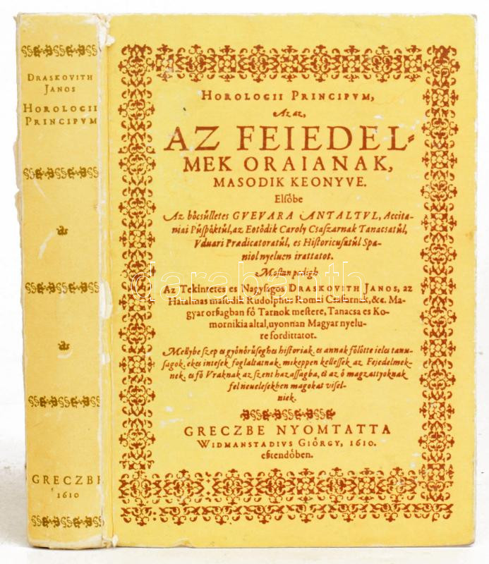 Draskovich János: Horologii principum azaz az fejedelmek órájának második könyve. [Bibliotheca Hungarica antiqua 23. Bp., 1989, Akadémiai]. Az 1610-ben Greczbe által kiadott könyv fakszimile kiadása. Kiadói kartonált papírkötés, kopott borítóval, kísérőfüzet nélkül.