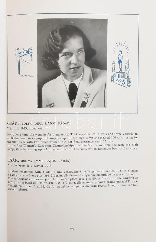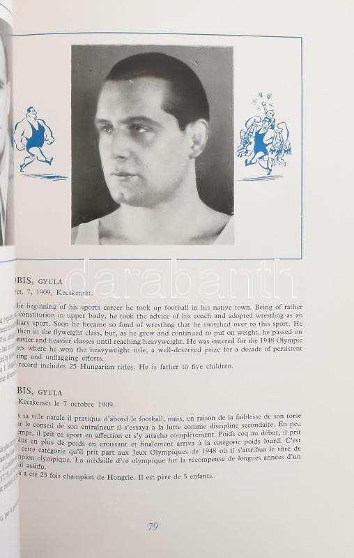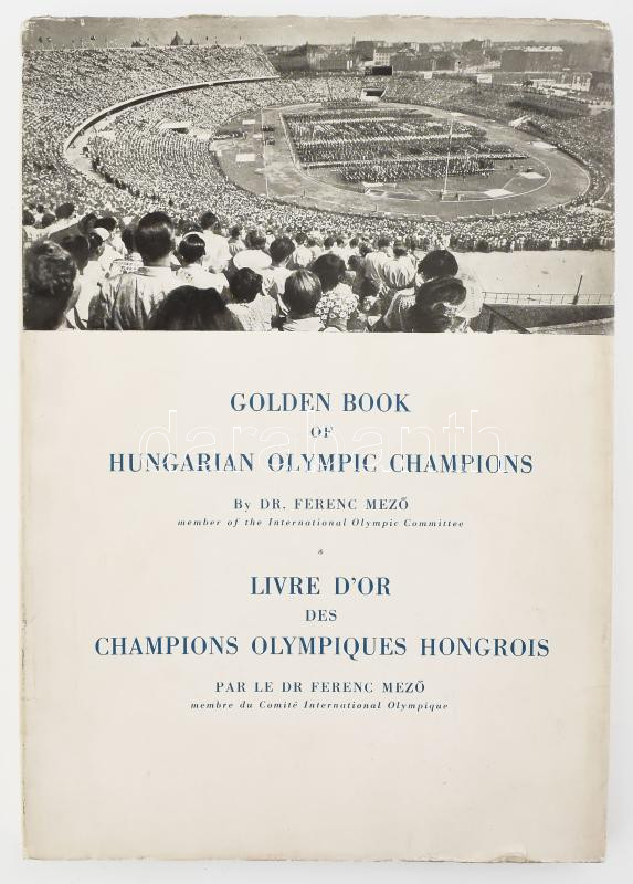 Mező, Ferenc: Golden book of Hungarian olympic champions. Bp., 1955, Sport. Angol nyelven. Gazdag fekete-fehér szövegközti képanyaggal illusztrált. Kiadói papírkötés, szakadt kiadói papírborítékkal.