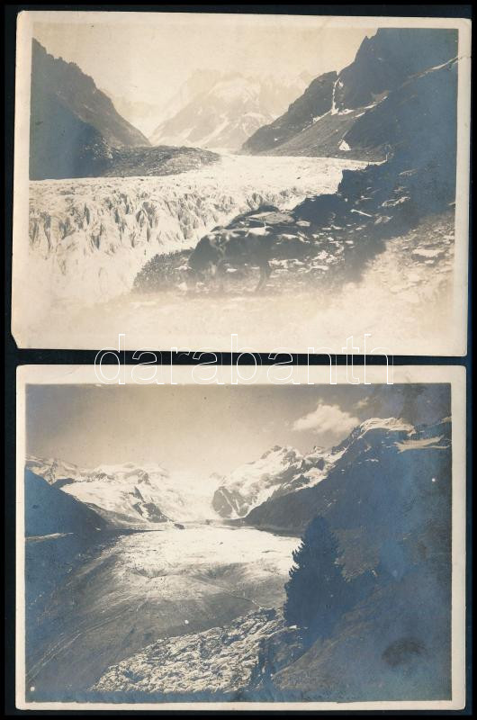 cca 1910-1920 Morteratsch (Svájc) és Mer de Glace (Franciaország) gleccserek, 2 db fotó, a hátoldalon feliratozva, az egyik szélén kis szakadással, 12x9 cm