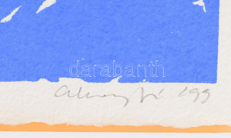 Aknay János (1949-): Kapcsolat. Szitanyomat, merített papír, jelzett, számozott (62/176?), 18×27 cm. Aknay Iszkaszentgyörgy 1996 feliratú mappában. + Aknay János (1949-): Geometrikus kompozíció. Nyomat, papír, jelzés nélkül, feltehetően egy katalógusból kivágva, 14x20,5 cm