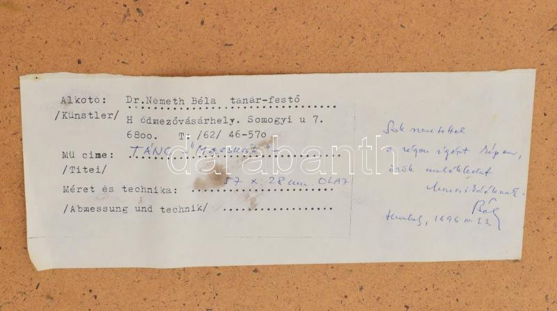 Beschreibung: Németh Béla: Tánc, Olaj, farost, jelzett, keretben, hátoldalán autográf sorokkal 29x58 cm