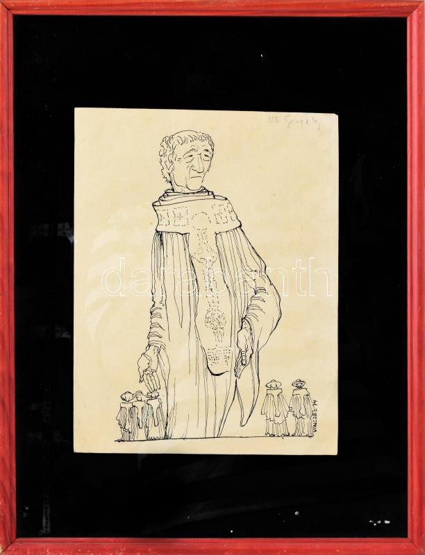 Vincze Lajos (1914-2002): VII. Gergely pápa (karikatúra vagy illusztráció). Tus, papír, jelzett és datált (Vincze L. 74), hátoldalán Magyar Hírlap bélyegzőjével. Üvegezett fakeretben. 26×19,5 cm