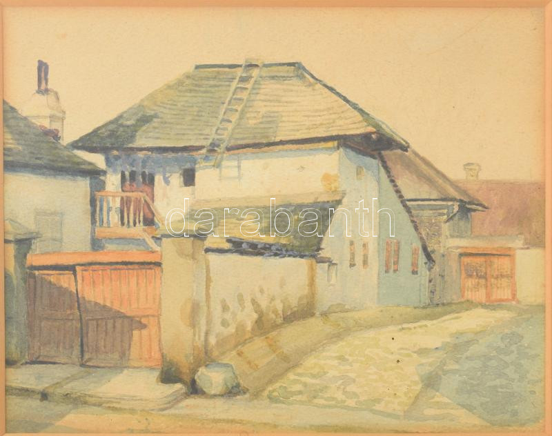 Jelzés nélkül, XX. sz. eleje: Utcarészlet (Tabán v. Szentendre?). Akvarell, papír. Üvegezett, sérült fakeretben.