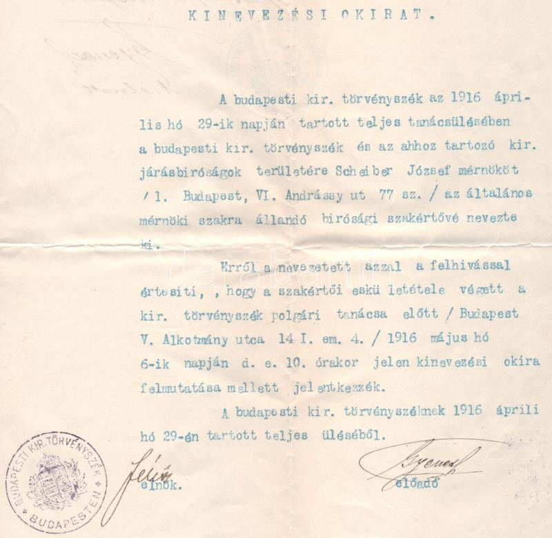 1916 Bp., Bírósági szakértői kinevezési okirat https://www.darabanth.com/de/488-Fernauktion/488.0/Kunst-Dokumente-andere-Sammelgebiete/Dokument~22/1916-Bp-Birosagi-szakertoi-kinevezesi-okirat~II3344586