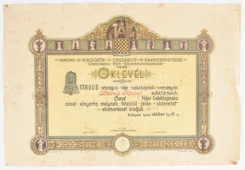 1948 Magyar Dolgozók Országos Sakkszövetsége oklevél, folttal, szakadá... https://www.darabanth.com/de/488-Fernauktion/488.0/Kunst-Dokumente-andere-Sammelgebiete/Dokument~22/1948-Magyar-Dolgozok-Orszagos-Sakkszovetsege-oklevel-folttal-szakadassal~II3292623