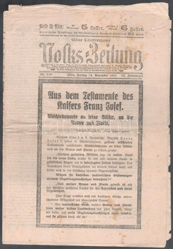 1916 Kleine Oesterreichische Volks-Zeitung 62. évf 326. sz. Nov. 24. F... https://www.darabanth.com/de/488-Fernauktion/488.0/Kunst-Dokumente-andere-Sammelgebiete/Drucksachen~1000014/1916-Kleine-Oesterreichische-Volks-Zeitung-62-evf-326-sz-Nov-24-Ferenc-Jozsef-vegrendeleter~II3297616
