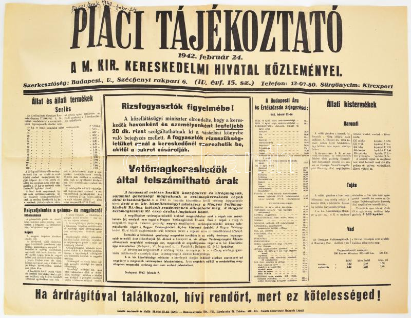 Beschreibung: 1942 Budapest Piaci árak hirdetménye, felhívás az árdrágítás ellen. 63x45 cm