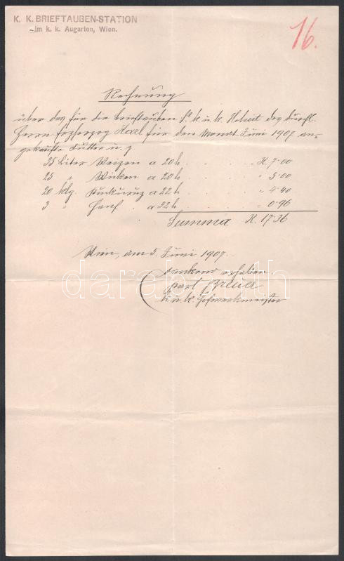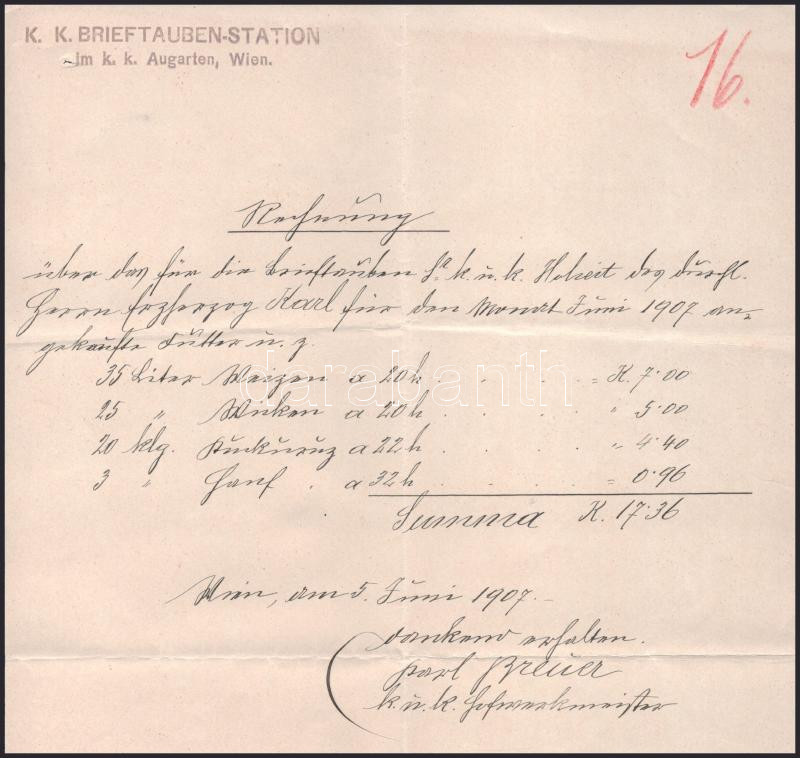 1906 Habsburg Károly, később IV. Károly király részére szóló számla k.u.k. postagalamb állomás pecsétjével /