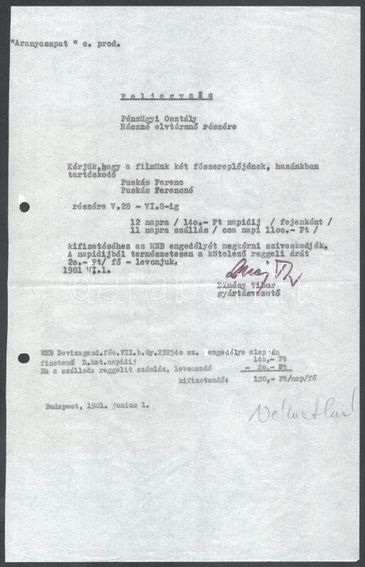 1981 Bp., Aranycsapat Pénzügyi Osztály feljegyzés napidíj kifizetéséről Puskás Ferenc és Puskás Ferencné részére