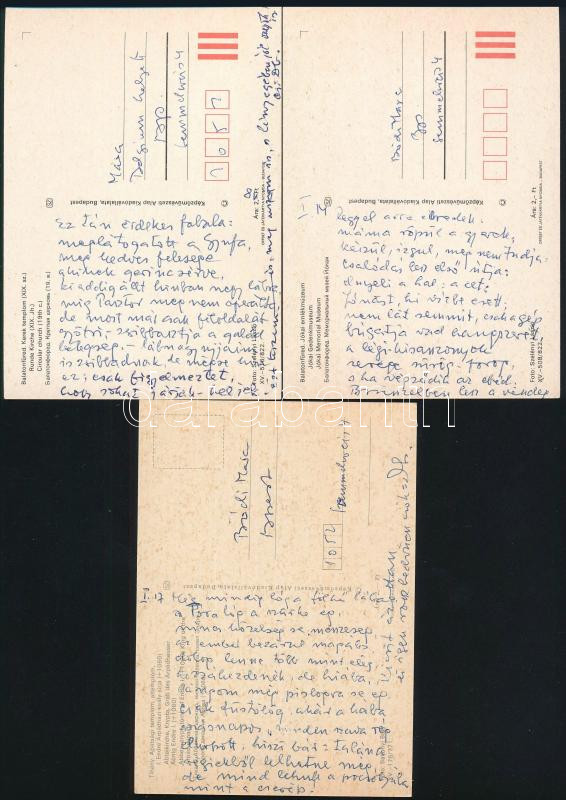 cca 1981-84 Keresztury Dezső (1904-1996) költő, korábbi korábbi vallás- és közoktatásügyi miniszter autográf, szellemes verses sorai Bódi Marának, össz .3 db balatonfüredi képeslapon, közte 2 db Keresztury Dezső autográf aláírásával. "Ez aztán érdekes fabula, meglátogatott a Gyula (...)"